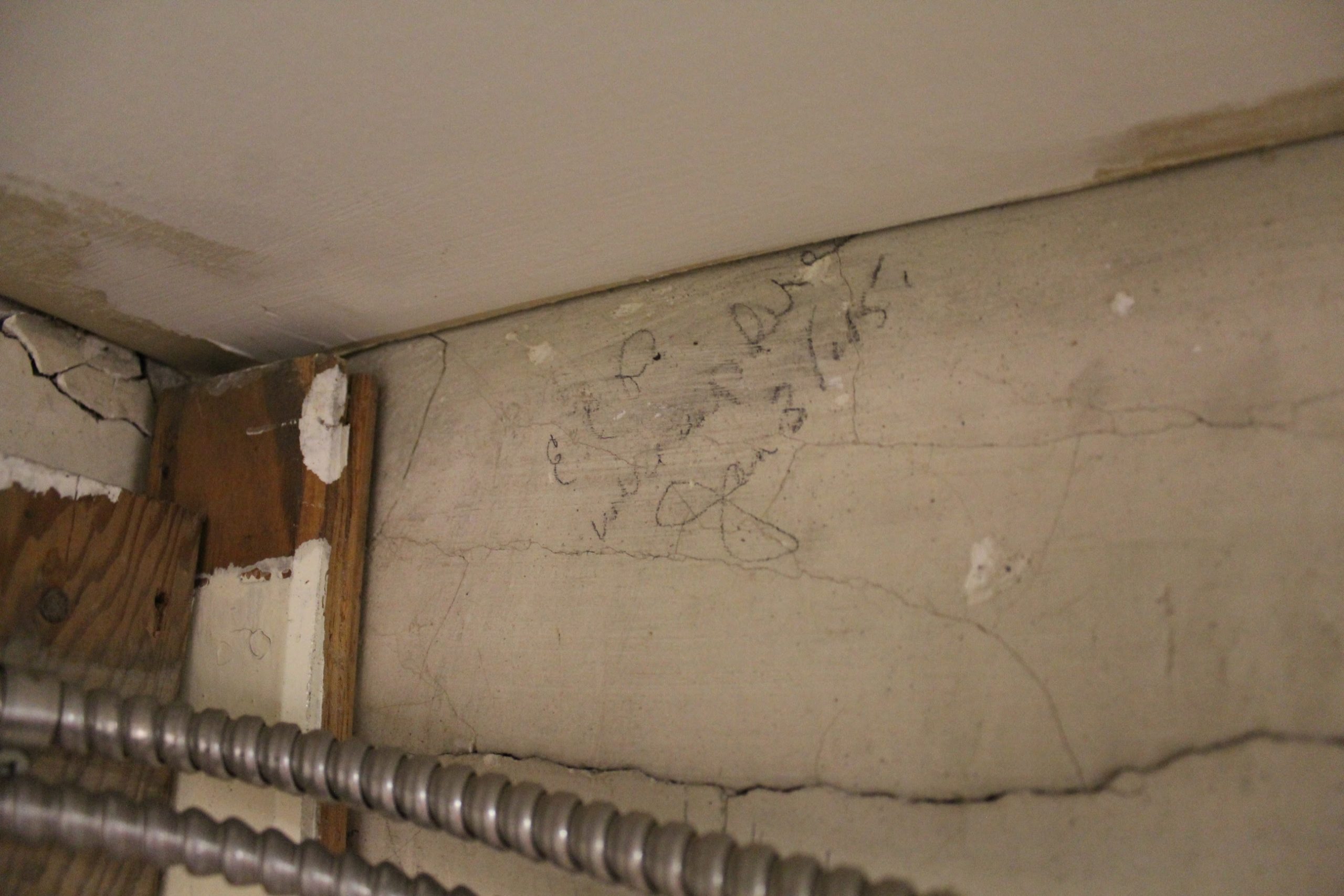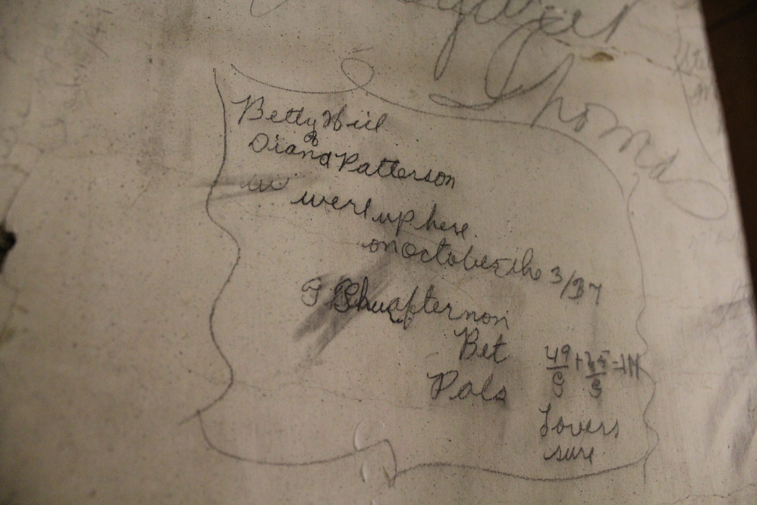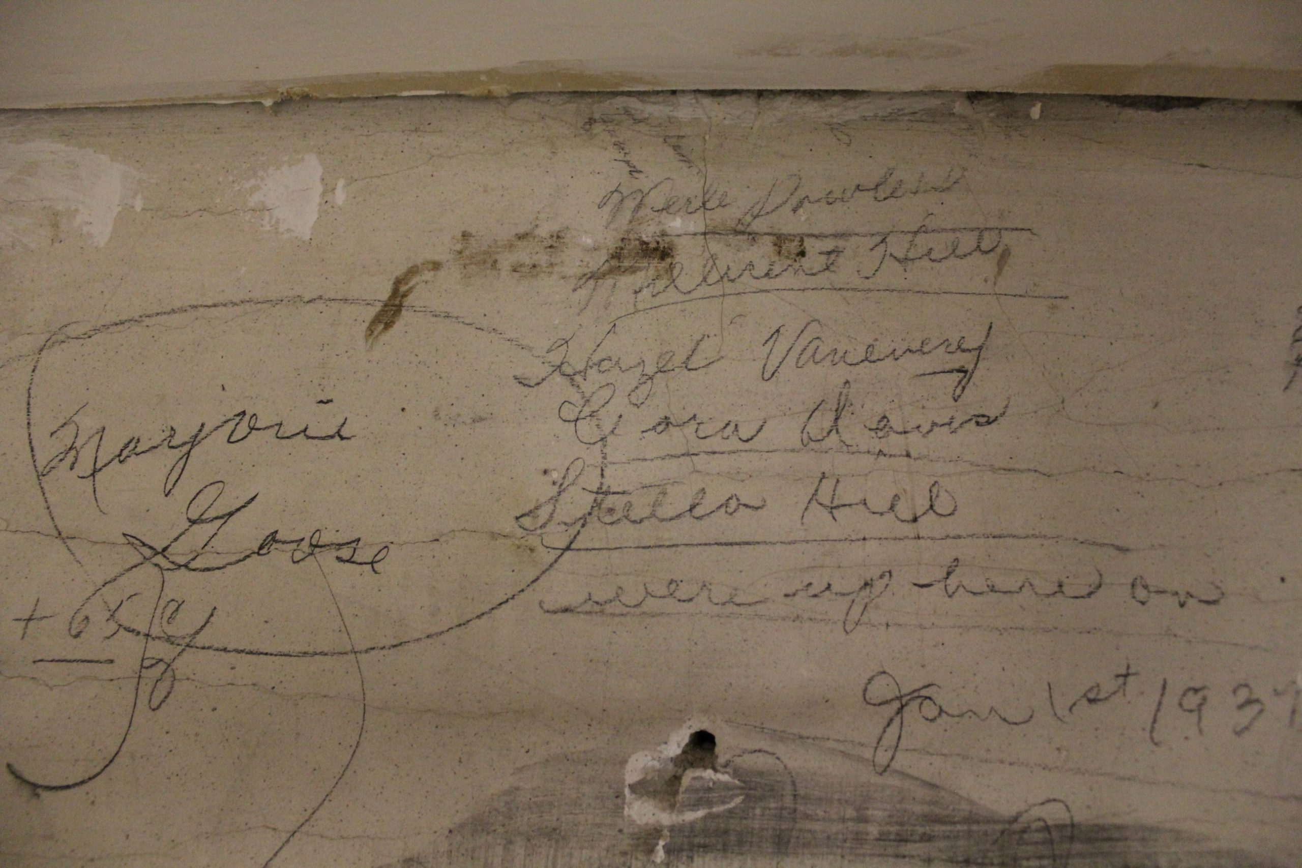 Discovered on the ‘girl’s side’ of their former stairwell. As you can see from the inscriptions, it was an area ‘hidden’ from staff but known to the students. Another rare find as we restore the Mohawk Institute.